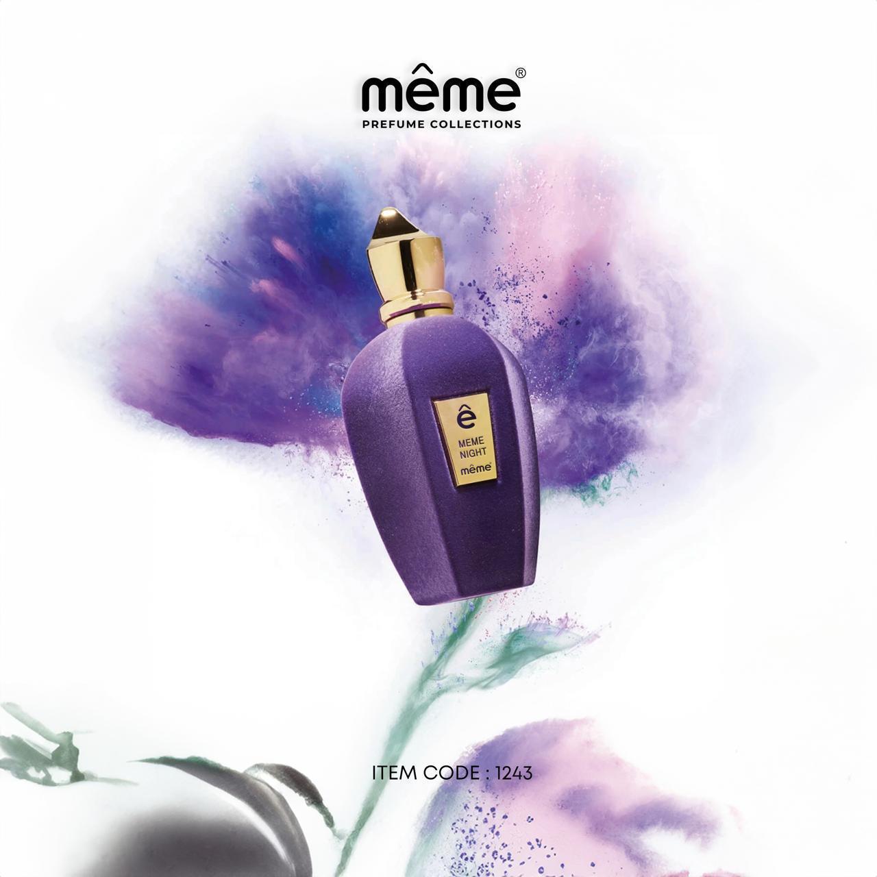 Meme Night Meme (מיים נייט מיים) מבית Meme הוא בושם יוניסקס בהשראת Accento (אצ’נטו) של Xerjoff (ז’רז’וף). ריח פרחוני-פירותי עם בסיס ענברי עשיר, שמשלב רעננות עם תחכום. מושלם למי שמחפש ניחוח מואר ובעל אופי.