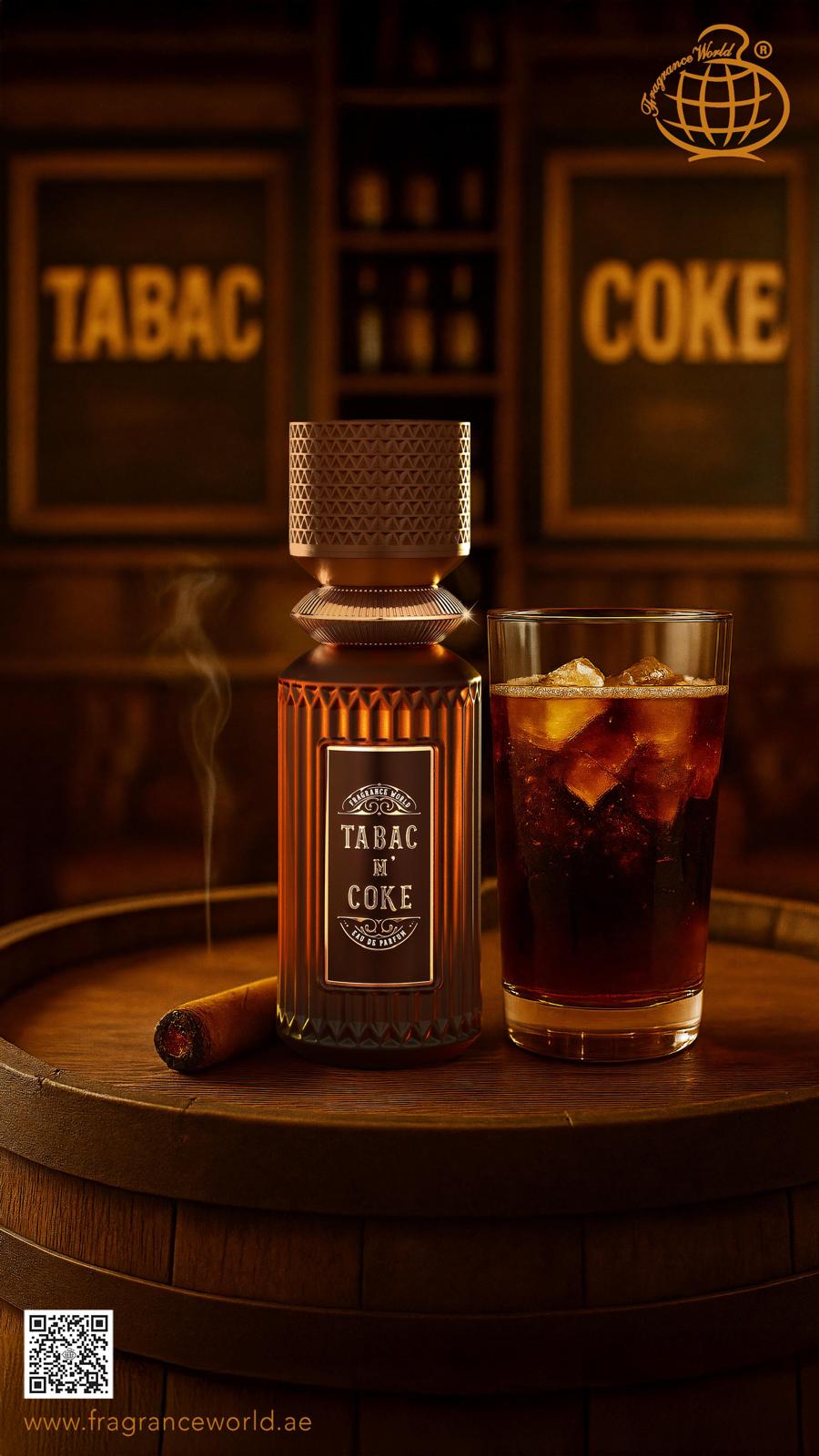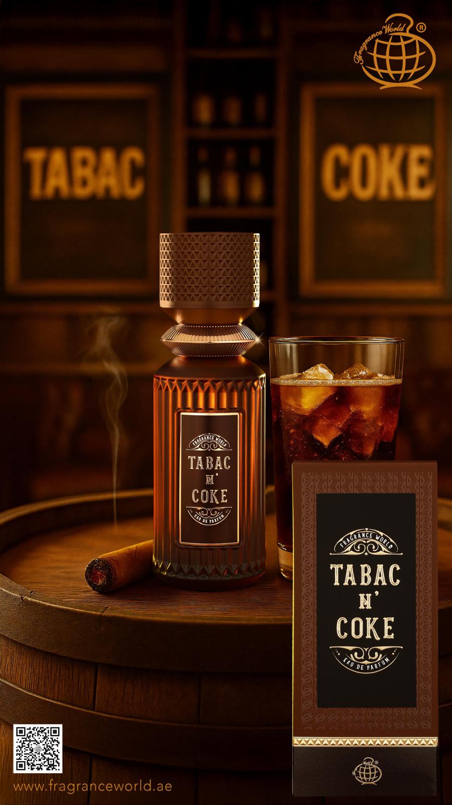 Tabac N’ Coke מבית Fragrance World (פרגרנס וורלד). בושם יוניסקס חדש עם תמצית עלי טבק מעושנים ונגיעות קולה מתקתקה – התוספת המושלמת לערב קריר, עם שיק אישי ובולט.